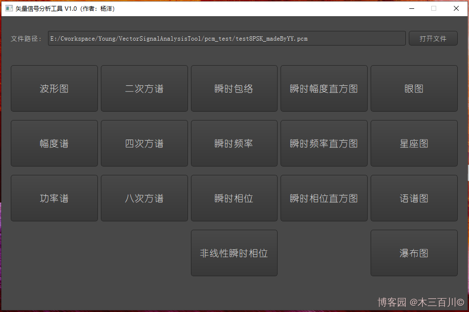 最近在学中频信号处理的一些东西,顺便用 QT 写了一个小工具,可以显示信号的时域波形图、幅度谱、功率谱、二次方谱、四次方谱、八次方谱、瞬时包络、瞬时频率、瞬时相位、非线性瞬时相位、瞬时幅度直方图、瞬时频率直方图、瞬时相位直方图、眼图、星座图、语谱图、瀑布图。